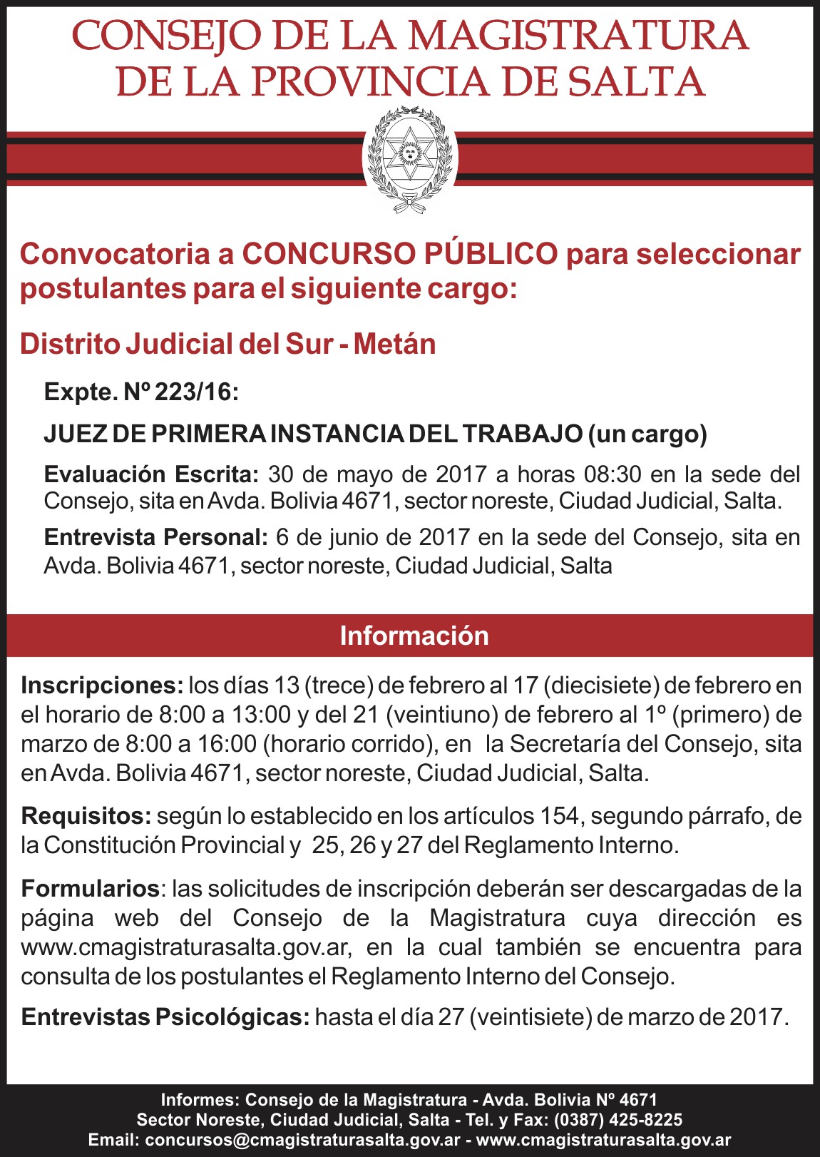 Es para el distrito judicial del Sur. Los interesados podrán inscribirse hasta el 01 de marzo próximo.