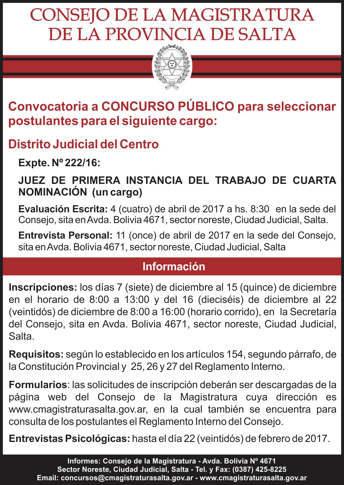 Convocan a concurso para cubrir cargo de juez laboral del Distrito Centro