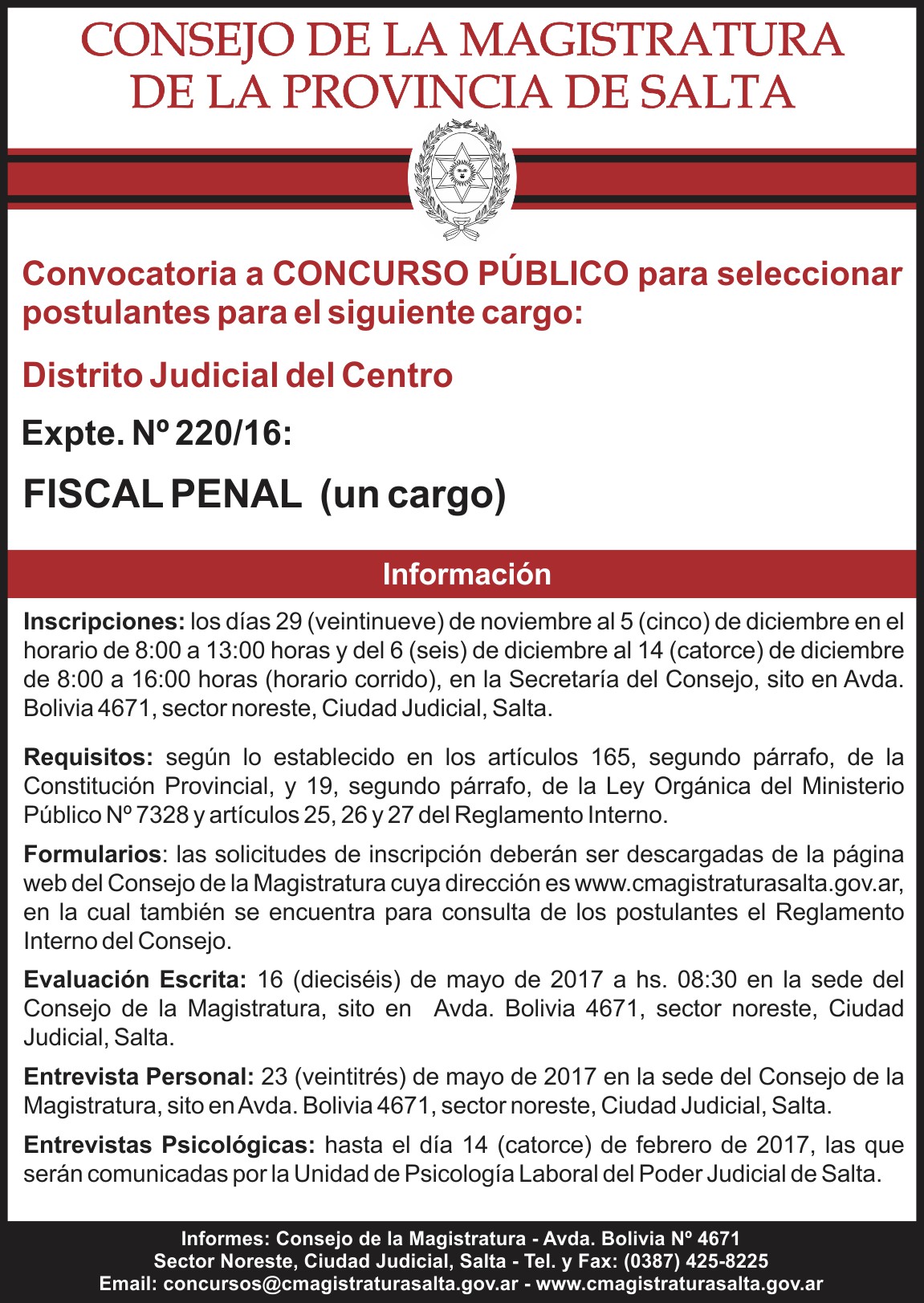 Publican admisibilidad de postulantes a Fiscal Civil, Comercial y Laboral para Tartagal