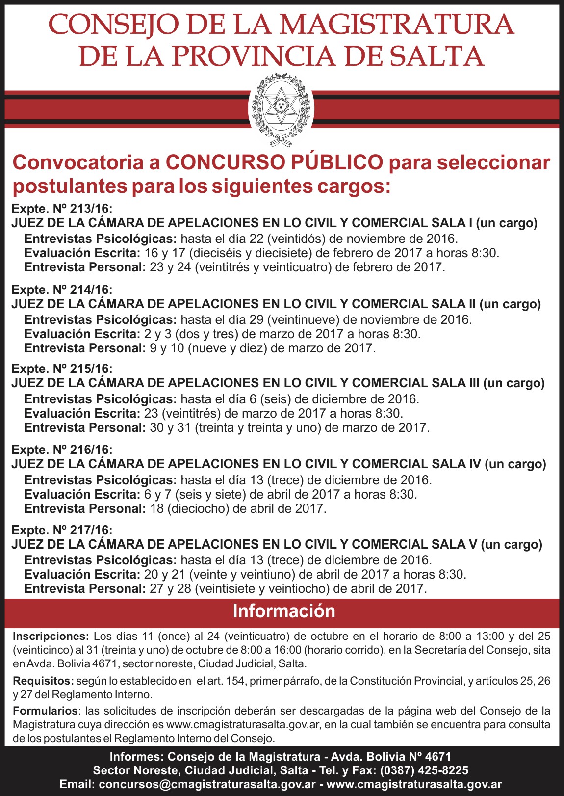 Convocan a concursos para cubrir cinco (5) cargos de Juez de la Cámara de Apelaciones en lo Civil y Comercial (un cargo para cada Sala)