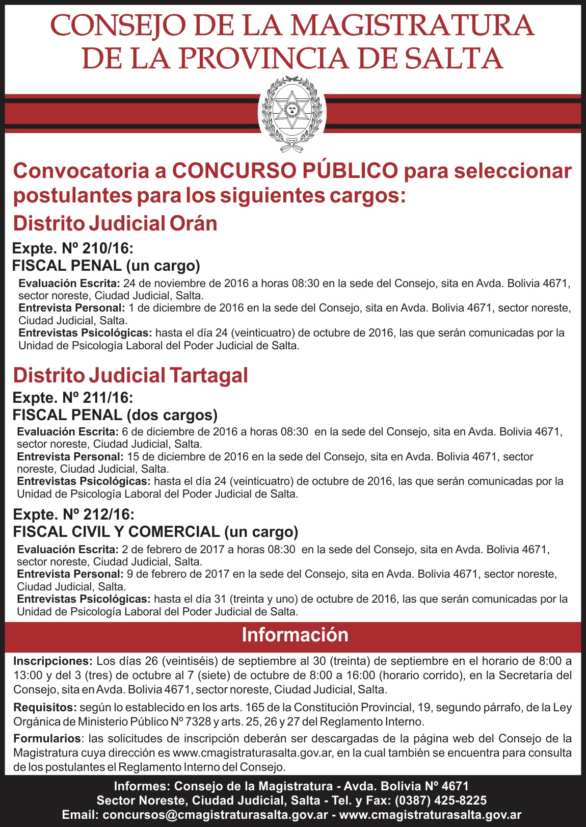 Se trata de cuatro cargos vacantes: un cargo de Fiscal Penal de Orán, dos cargos de Fiscal Penal de Tartagal