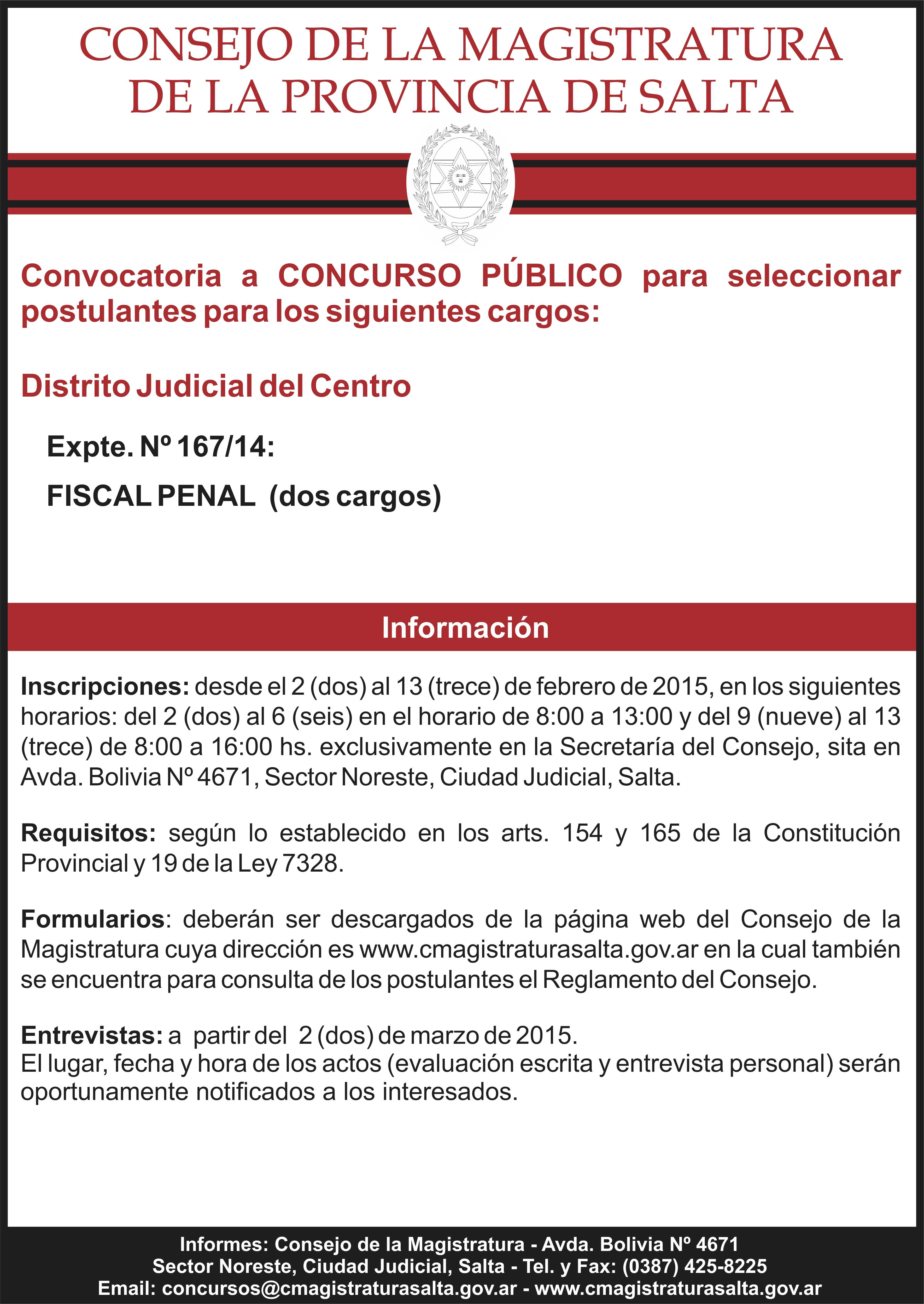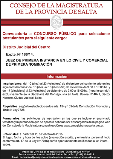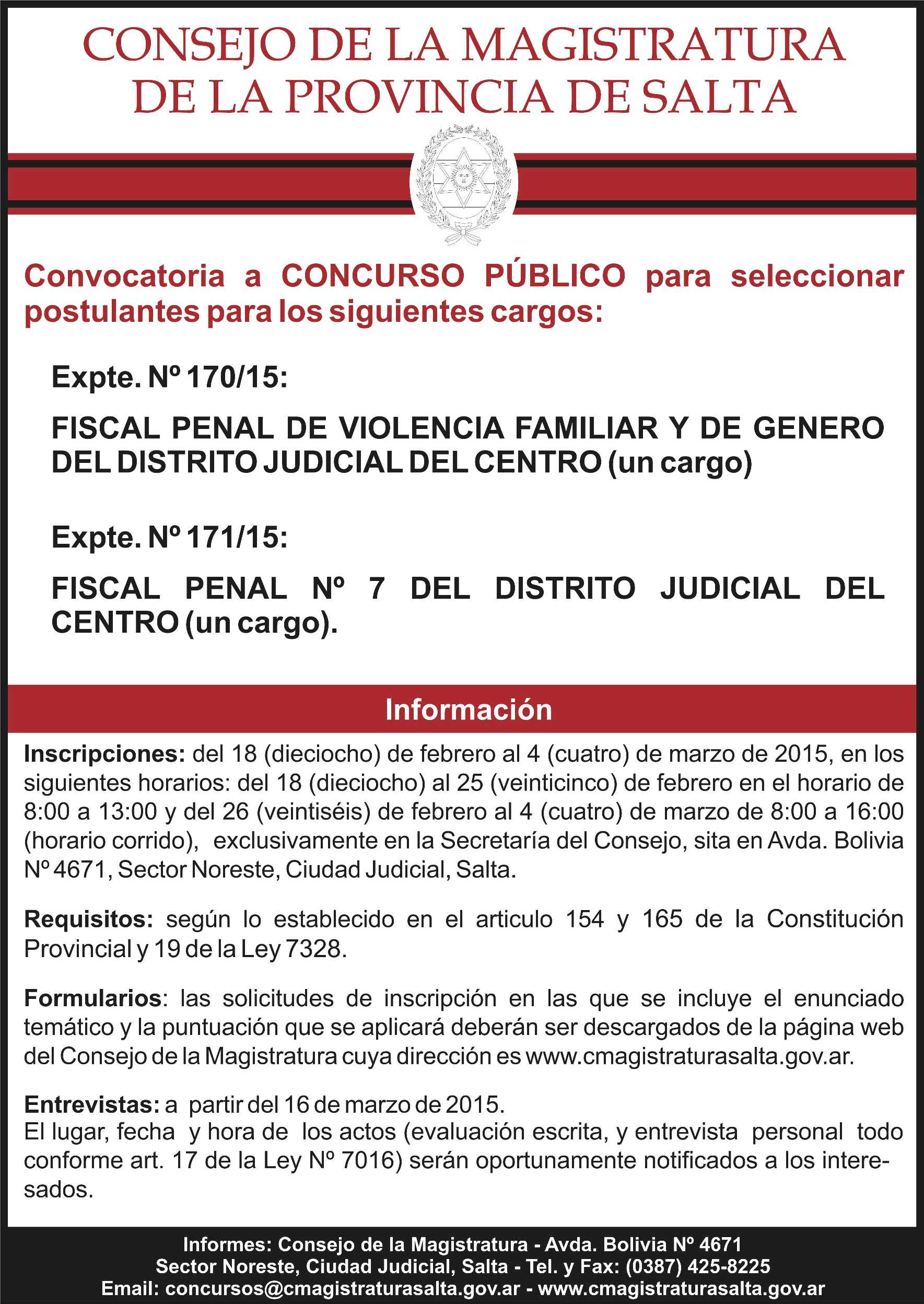 Para el Distrito Judicial del Centro (dos cargos) y los Distritos Judicial de Orán (un cargo), Tartagal (un cargo) Y